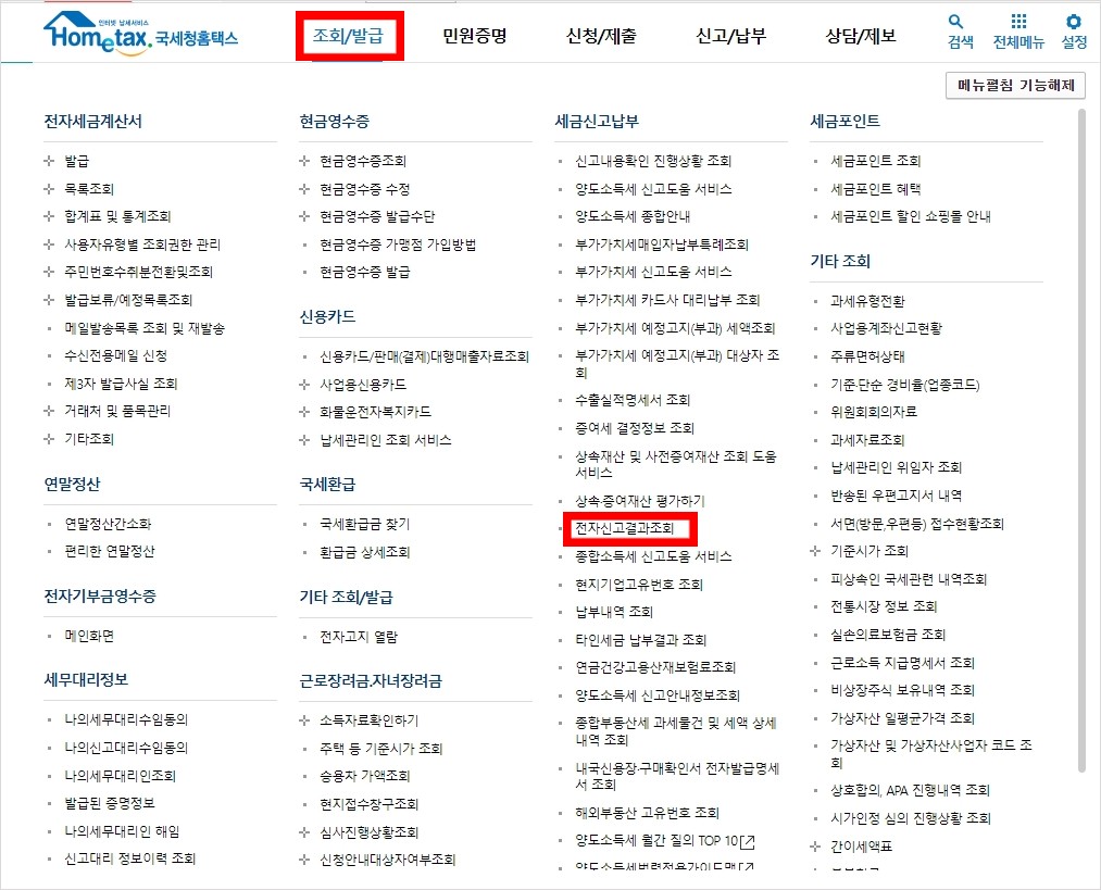 2. 조회/발급 > 전자신고결과조회 클릭