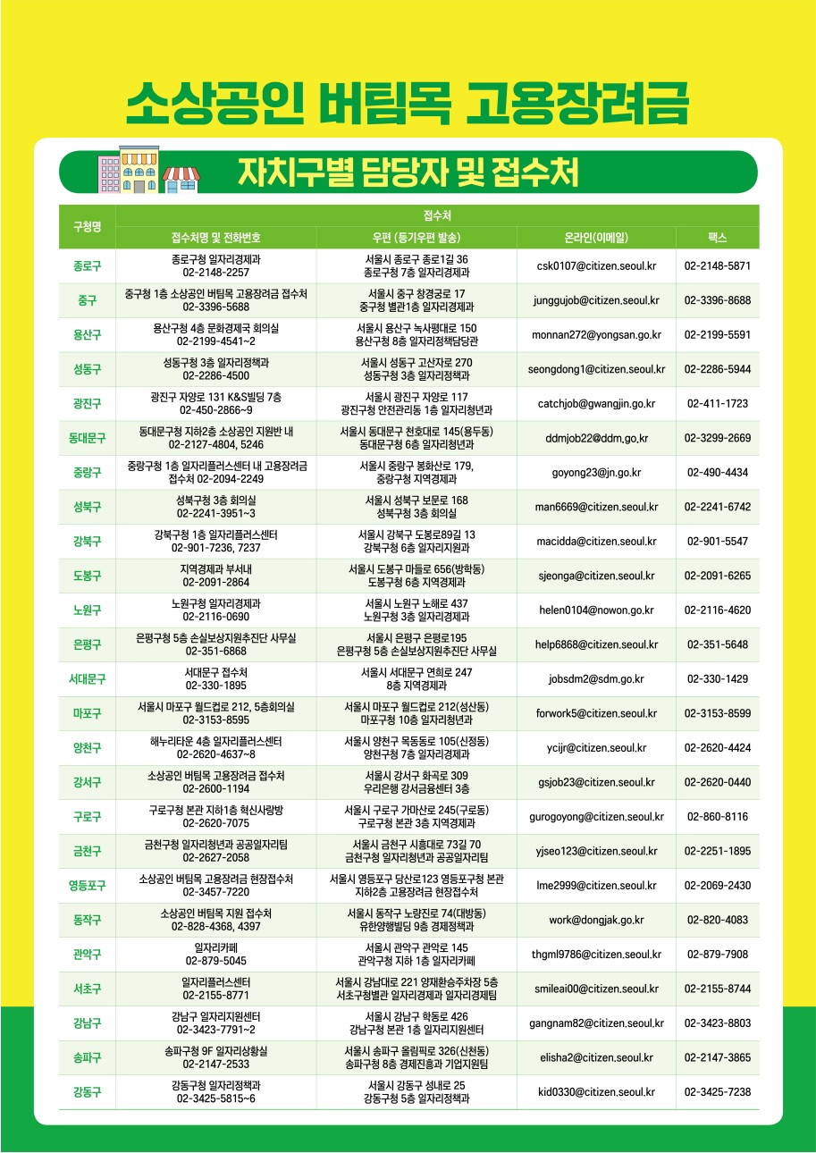 - 기업체 소재 자치구(현장접수, 이메일, 우편, FAX, 찾아가는 접수 서비스 등)