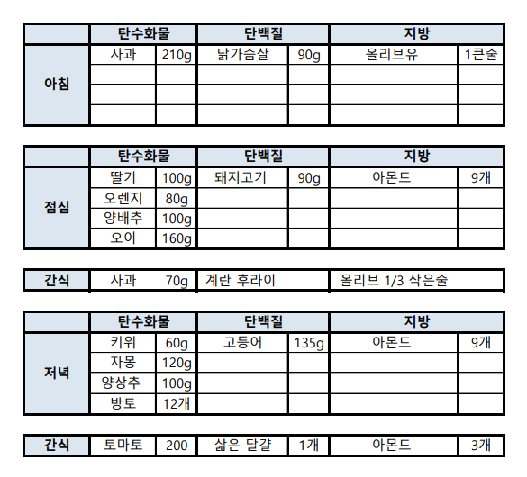 아침은 바쁘니깐 사과 하나로만 간단하게 먹으면 됩니다. 물론 골고루 먹는게 가장 좋습니다. 1블럭이 70g이니깐 3블럭은 210g 이겠죠? 단백질과 지방은 후라이팬에 올리브유 1큰술과 닭가슴살 90g을 요리하면 됩니다. 이렇게 하면 아침은 끝입니다. 요리할 시간 없으면 인터넷에서 구매할 수 있는는 닭가슴살 약 21g(7g*3 블럭) 드시고 아몬드 18개(닭가슴살은 지방이 거의 없으니 지방 1블럭=3g=아몬드 6개*3블럭) 드시면 됩니다.